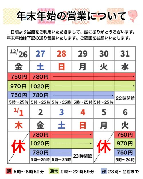 • たっぷり営業! 12月26日(金)〜30日(火)は、深夜1時まで(25時まで)ゆっくりと海王の温泉をご堪能いただけます!